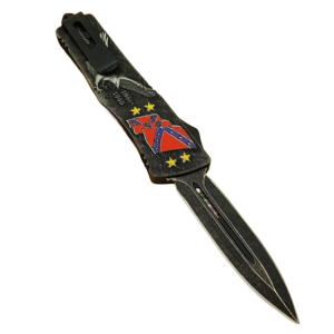 5.75″ CLOSED, 9″ OVERALL, OTF KNIFE.BLACK STAINLESS STEEL BLADE & HANDLE WITH MOLLE NYLON SHEATH