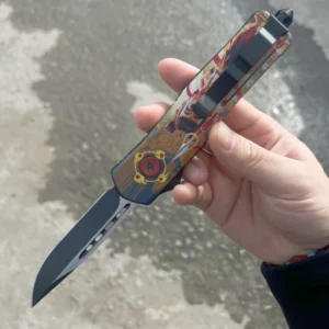 Add a unique and functional piece to your collection with this custom OTF (Out-The-Front) knife. The knife’s handle features an eye-catching artistic design that combines vibrant colors with traditional craftsmanship. The Nezha-coated steel blade is strong and sharp, perfect for both tactical and everyday use. Its smooth, reliable deployment mechanism makes it a great choice for personal use or wholesale purchases.