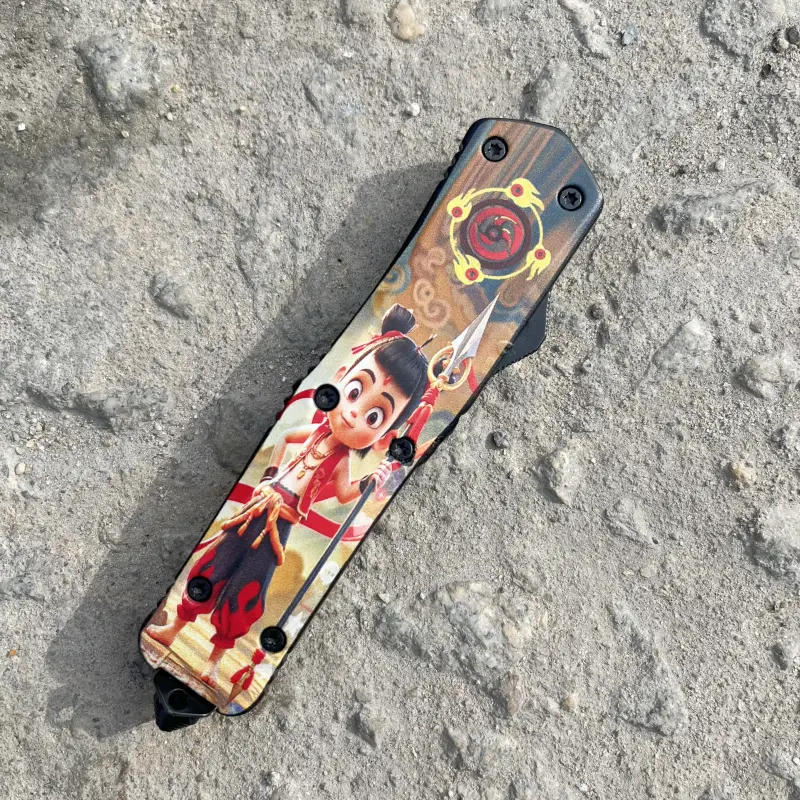 Add a unique and functional piece to your collection with this custom OTF (Out-The-Front) knife. The knife’s handle features an eye-catching artistic design that combines vibrant colors with traditional craftsmanship. The Nezha-coated steel blade is strong and sharp, perfect for both tactical and everyday use. Its smooth, reliable deployment mechanism makes it a great choice for personal use or wholesale purchases.